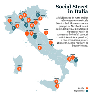 Social Street è un esperimento nato a Bologna in via Fondazza, promosso da Federico Bastiani. Federico nella vita fa il giornalista oltre che il papà. L'anno scorso si è reso conto che nonostante abitasse in quel quartiere da tre anni non conosceva nessuno e cosa ancor peggiore non aveva la possibilità di far giocare il figlio con altri bambini del quartiere. E' stato questo bisogno a far scattare l'esigenza di creare una rete di vicinato che potesse rinvigorire i rapporti tra le persone del quartiere. Federico ha deciso così di creare un gruppo Facebook e sancire la nascita del gruppo con l'affissione e la distribuzione di volantini autoprodotti. Ed è così che in pochissimo tempo il gruppo Facebook si è ampliato ed ha iniziato ad incontrarsi nel quartiere, iniziando così una condivisione tra i vari abitanti. Questa condivisione alimenta una nuova socialità di quartiere oltre che tutta una serie di pratiche di scambio di beni e servizi. Una economia di prossimità basata su una florida rete di nuove relazioni. Il modello è talmente efficace che in pochissimo tempo il format è stato replicato in molte altre città italiane (qui un linkcon le città in cui è attivo social street).